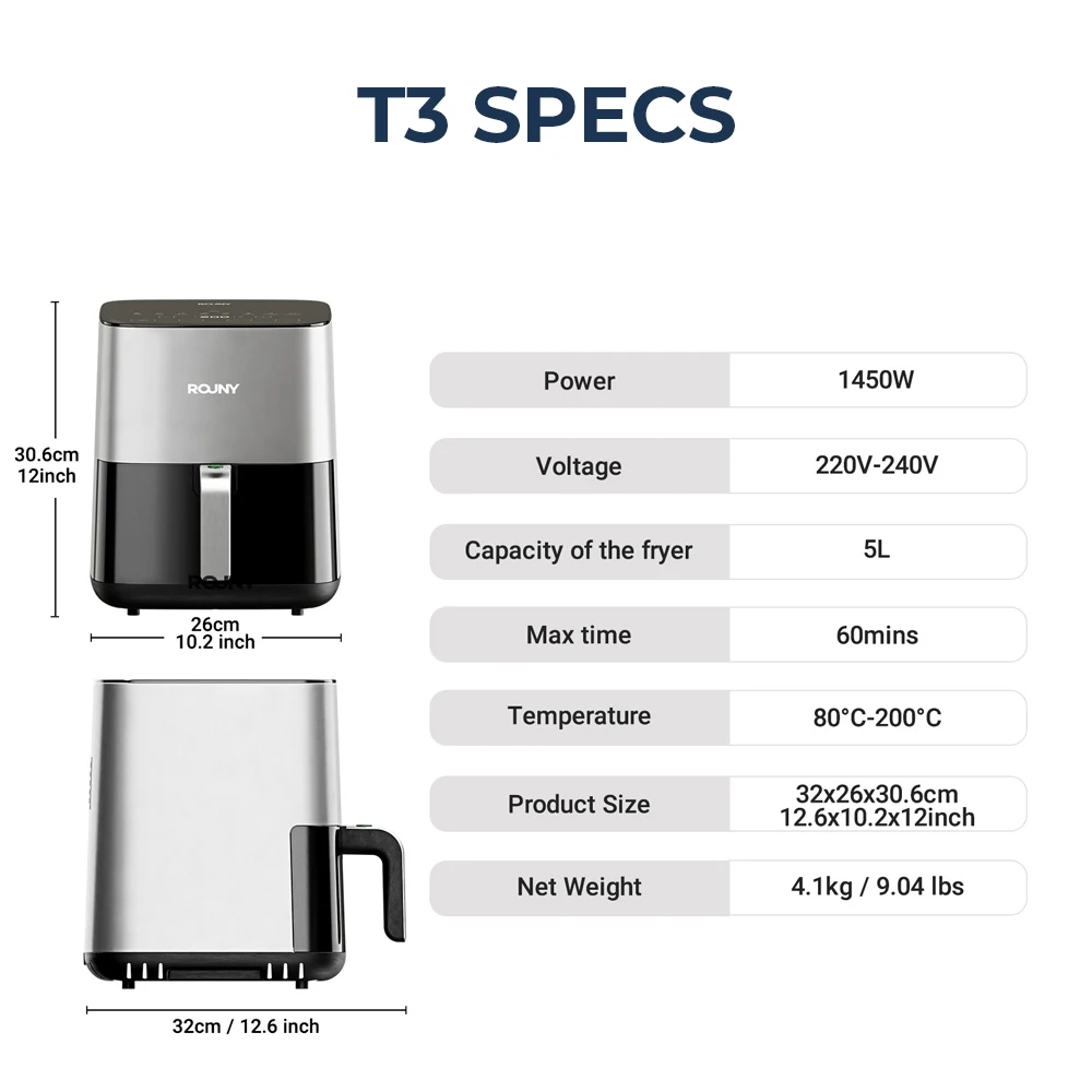 Atraskite sveikesnį ir greitesnį maisto gaminimo būdą su Rouny 5L Smart Air Fryer 🍟🔥 Ši karšto oro gruzdintuvė leidžia ruošti traškius patiekalus beveik be aliejaus – puikiai tinka bulvytėms, vištienai, daržovėms, žuviai ar net desertams.
